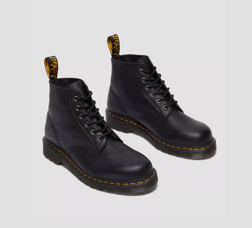 Abbiamo rivoluzionato il nostro stivale con lacci 101 a sei occhielli utilizzando la lussuona Ambassador: una pelle morbida dall'aspetto testurizzato e martellato. La sua morbidezza rende il modello Dr. Martens Original ancora più facile da indossare. La suola presenta le classiche rifiniture gialle DM's e il nostro caratteristico motivo scanalato. Sul tallone, troverai sempre l'inconfondibile linguetta gialla e nera AirWair.