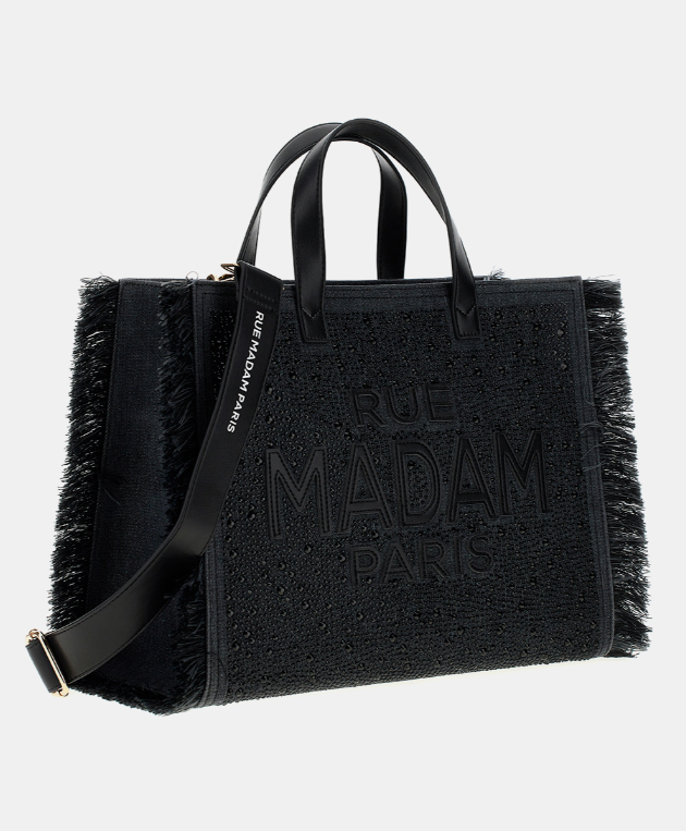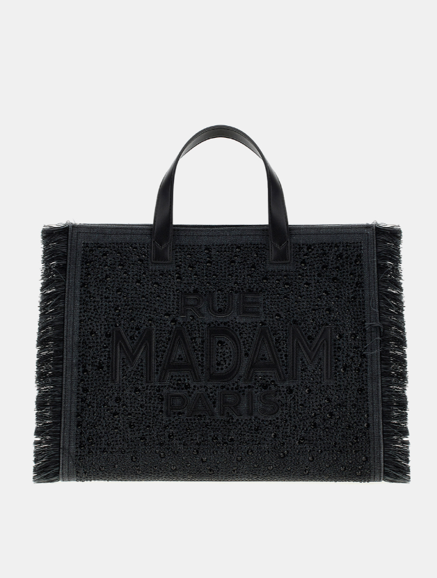 Tote Bag in canvas con strass e frange. Logo e manici in pelle vegan. Tracolla rimovibile e regolabile e fodera interna in cotone con tasca. L 36 W 17 H 29