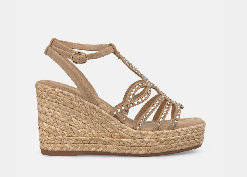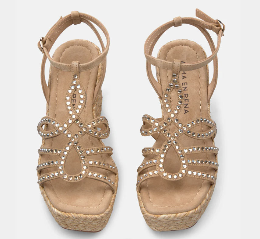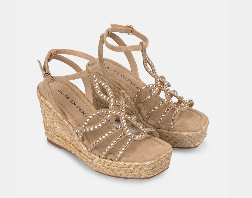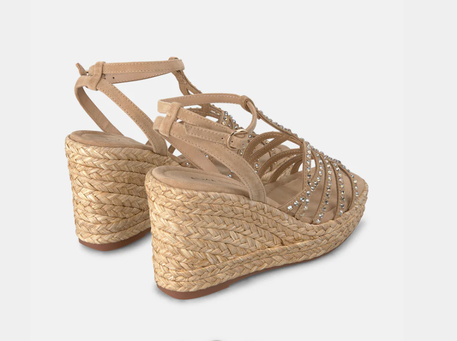 Sandalo con zeppa e cinturini incrociati, dettagli in strass, punta quadrata. Chiusura con fibbia e altezza del tacco di 9,8 cm.
