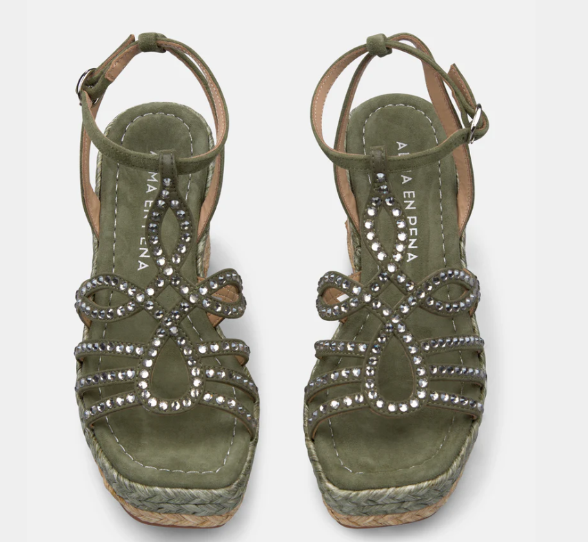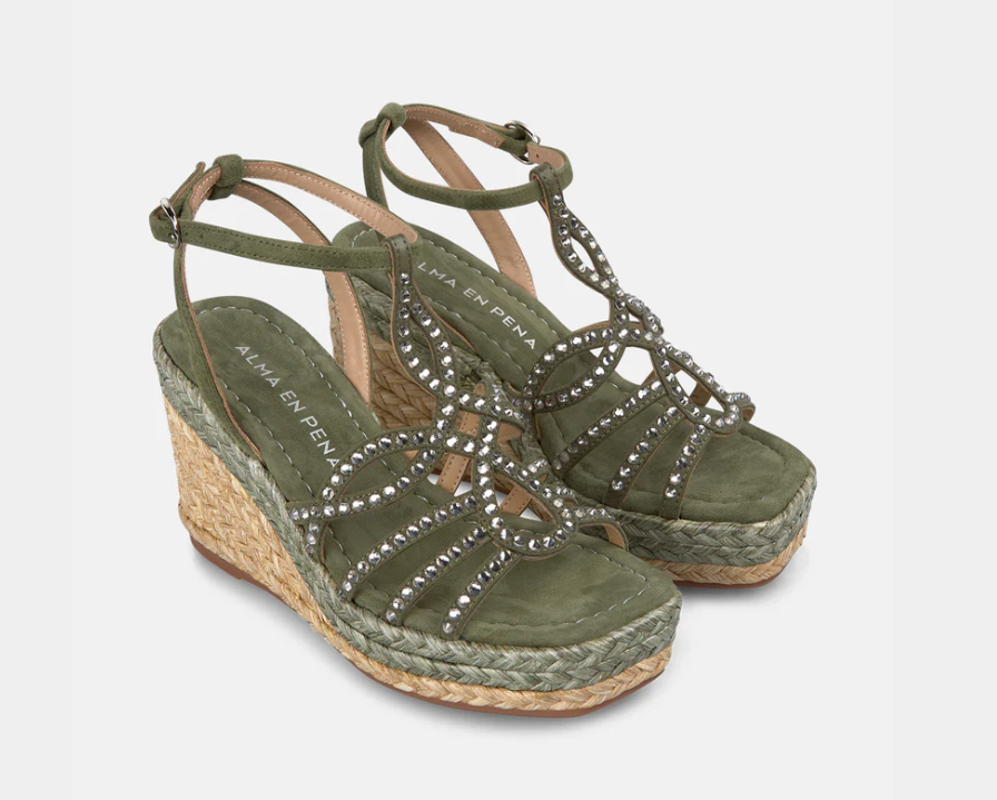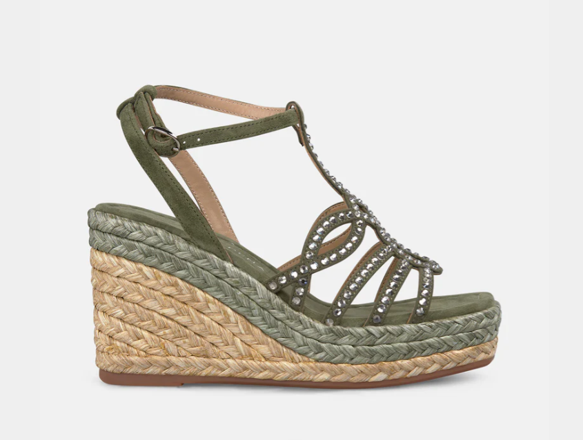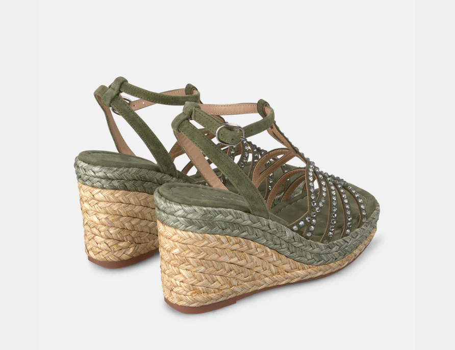 Sandalo con zeppa e cinturini incrociati, dettagli in strass, punta quadrata. Chiusura con fibbia e altezza del tacco di 9,8 cm.