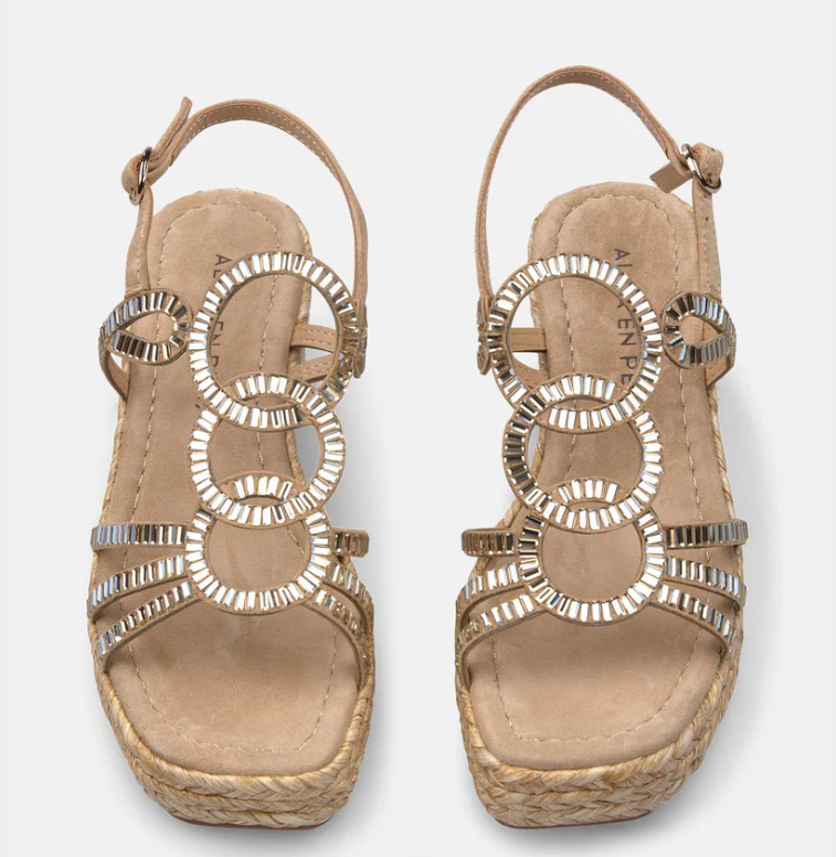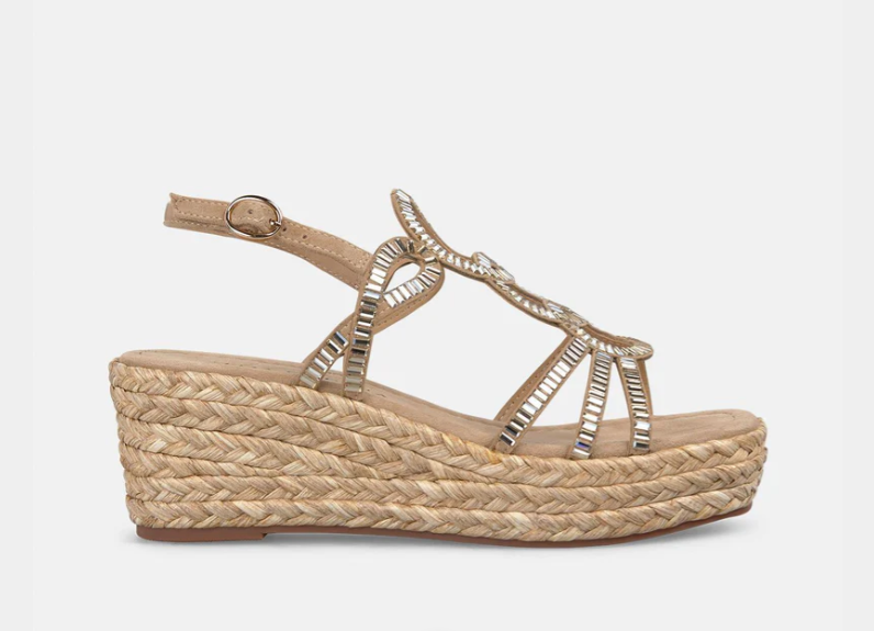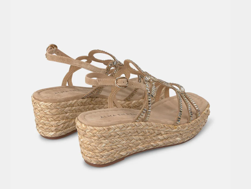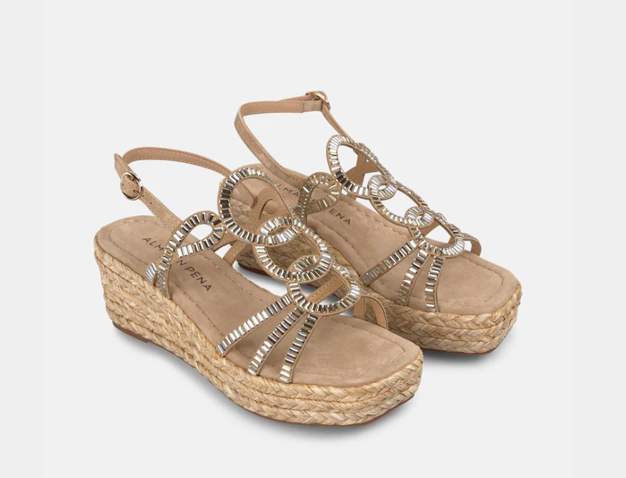 Sandalo con zeppa media, dettagli lucidi sui cinturini e punta quadrata. Chiusura con fibbia e tacco alto 7 cm.
