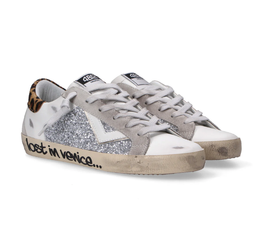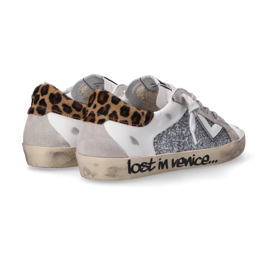Realizzate in pelle bianca e camoscio grigio con effetto vintage, decorazione laterale con glitter di colore argento e pelle di colore bianco con profilo platino. Tallone realizzato in cavallino con stampa leopardata. Lacci in cotone di colore grigio perla. Plantare interno estraibile di 3 cm. Suola vulcanizzata in gomma di colore beige.