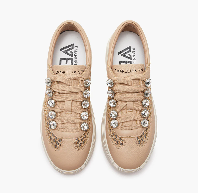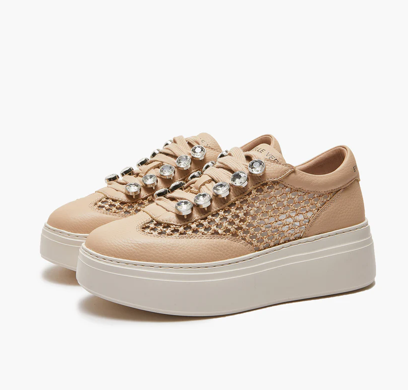 Sneakers allacciata, suola a cassetta in eva leggera, pelle martellata laminata e raffia laterale in tinta, dettaglio strass sull'allacciatura