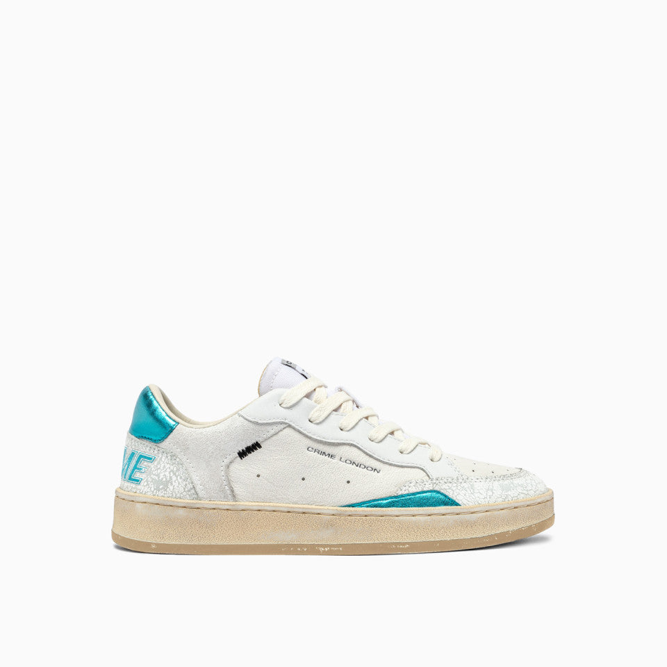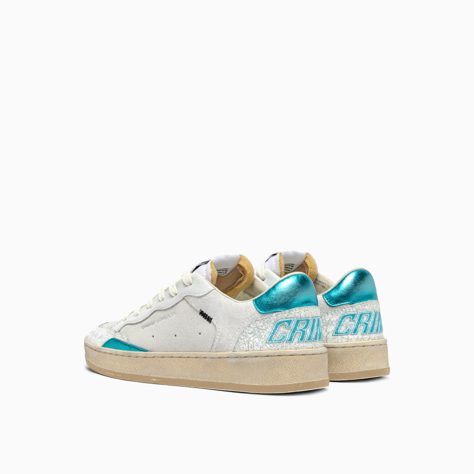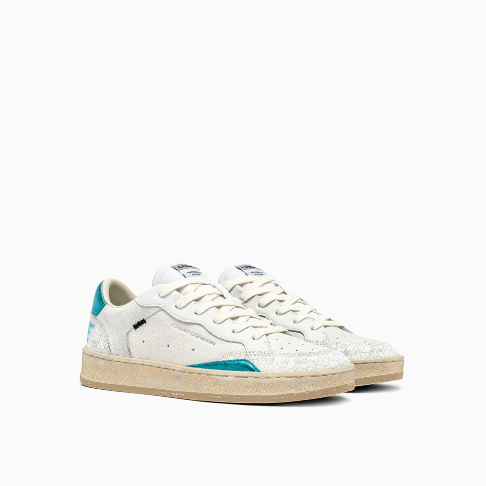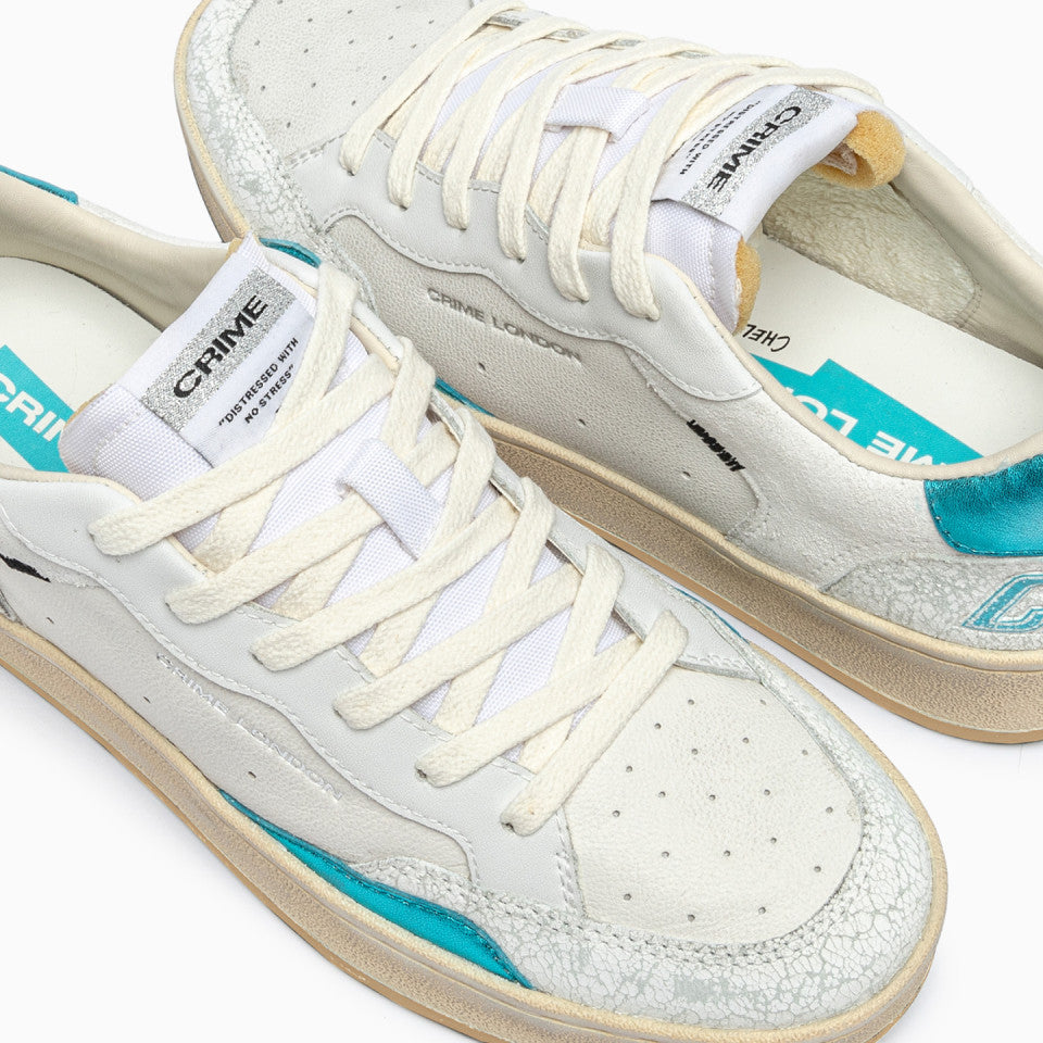 Tomaia in pelle e suede bianca con cracklé bianco, dettagli in lamina turchese