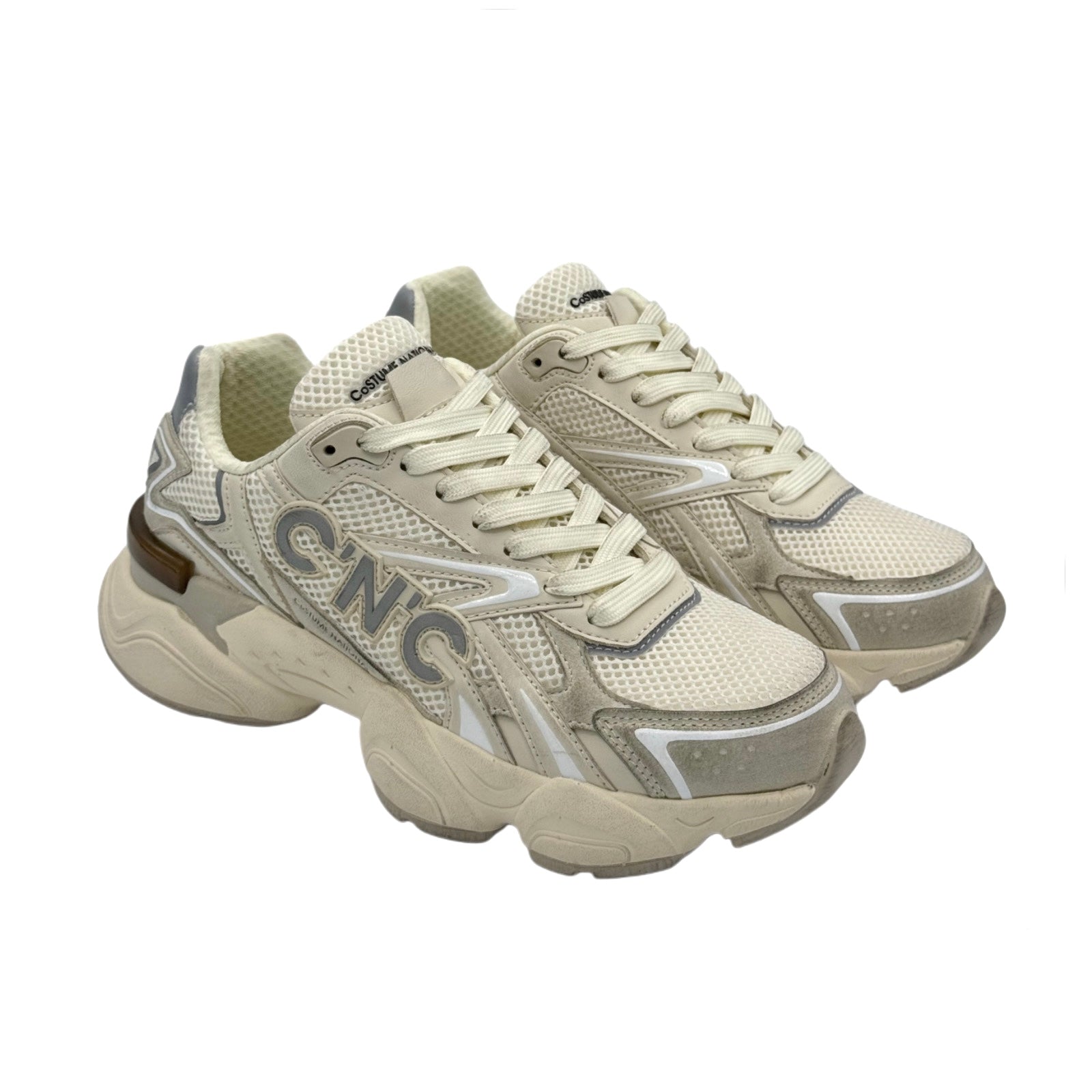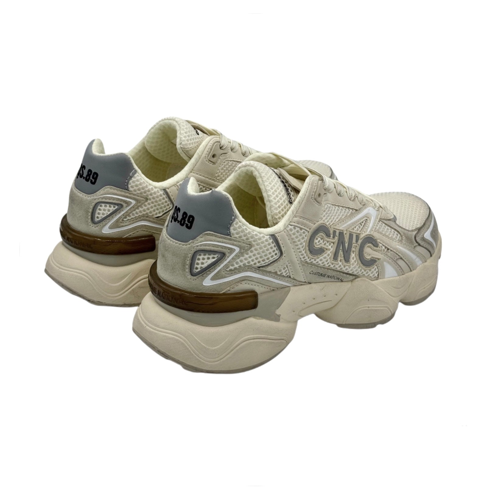C'N'C' Costume National pesenta una sneaker realizzata con un mix di colori e materiali, quali la pelle scamosciata, il tessuto mesh e gli inserti gommati. Laccio parlato, fodera interna e soletta estraibile in tessuto. Suola in gomma bombata alta 4 cm.